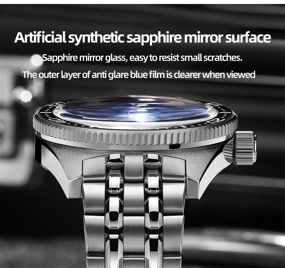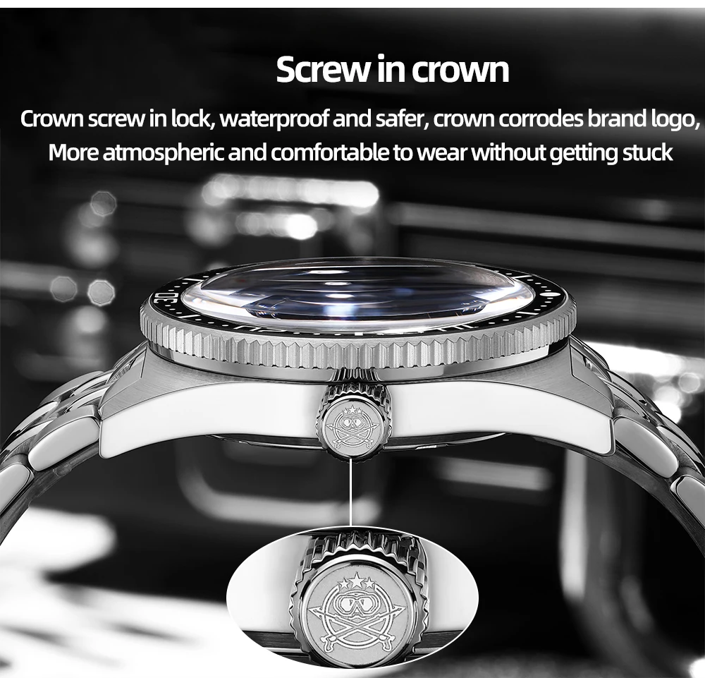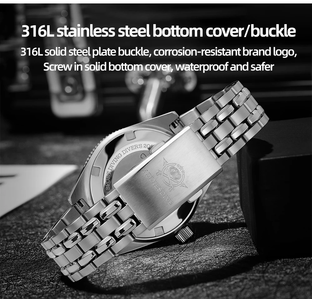 The 120-tooth unidirectional rotating bezel is also luminescent, perfect for divers. With a screw-down crown, screw-in case back, and 200M water resistance, this watch is suitable for hand washing, swimming, and diving. The 316L stainless steel bracelet with bracelet clasp provides a secure and comfortable fit.