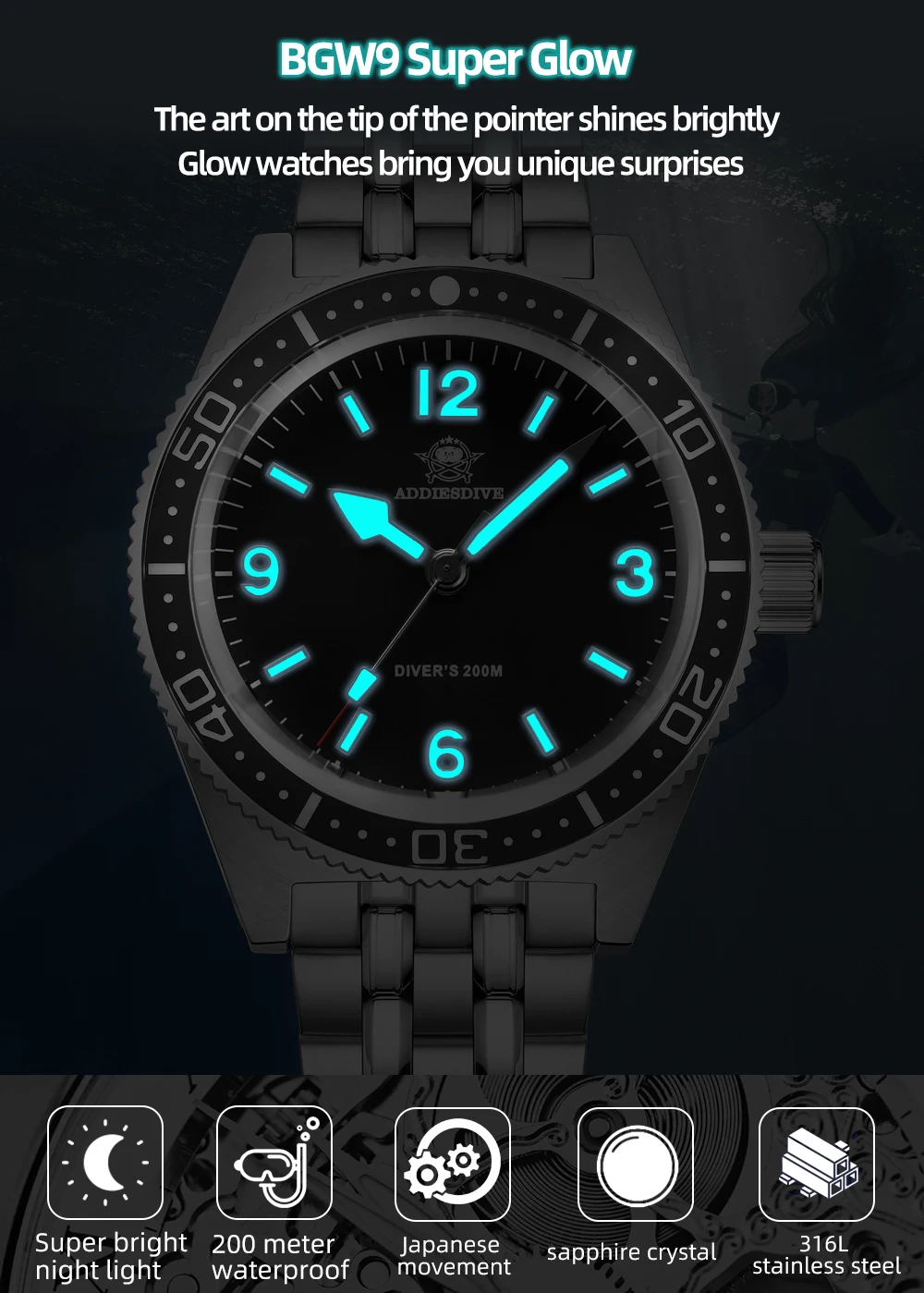 • Luminous Visibility: BGW9 super luminous markers and hands for low-light conditions.