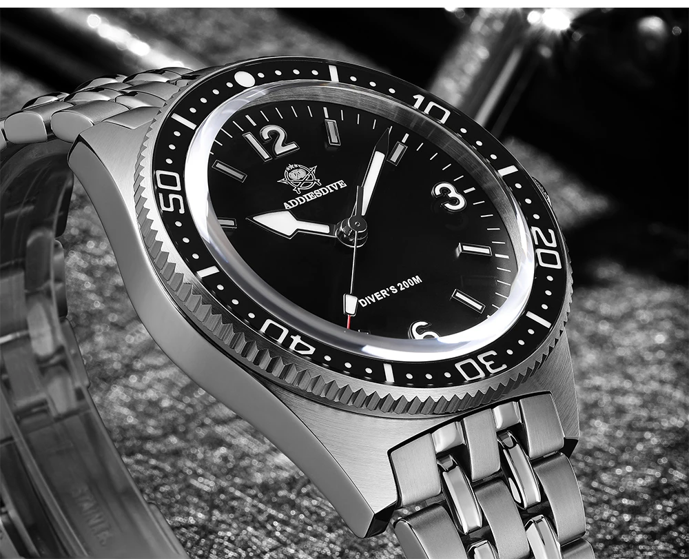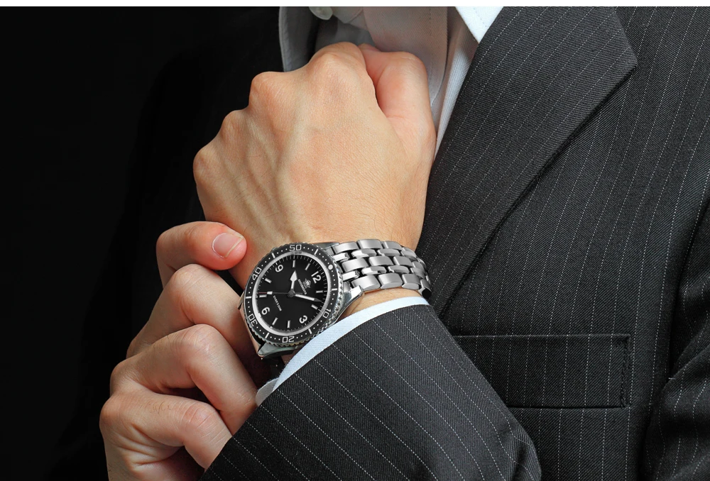 • Stylish Design: Black enameled dial with modern luxury dive watch aesthetics.