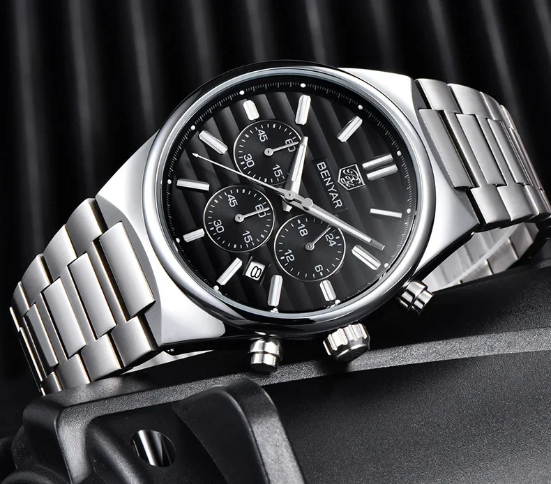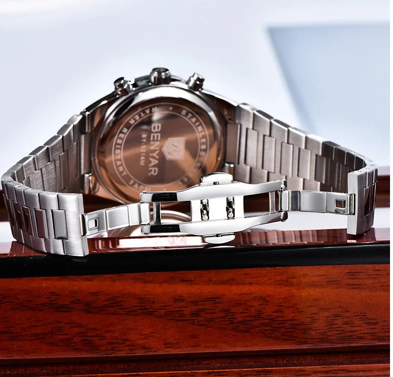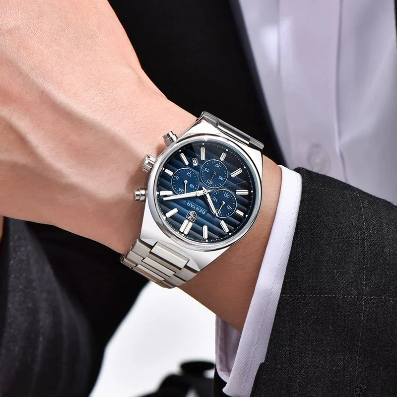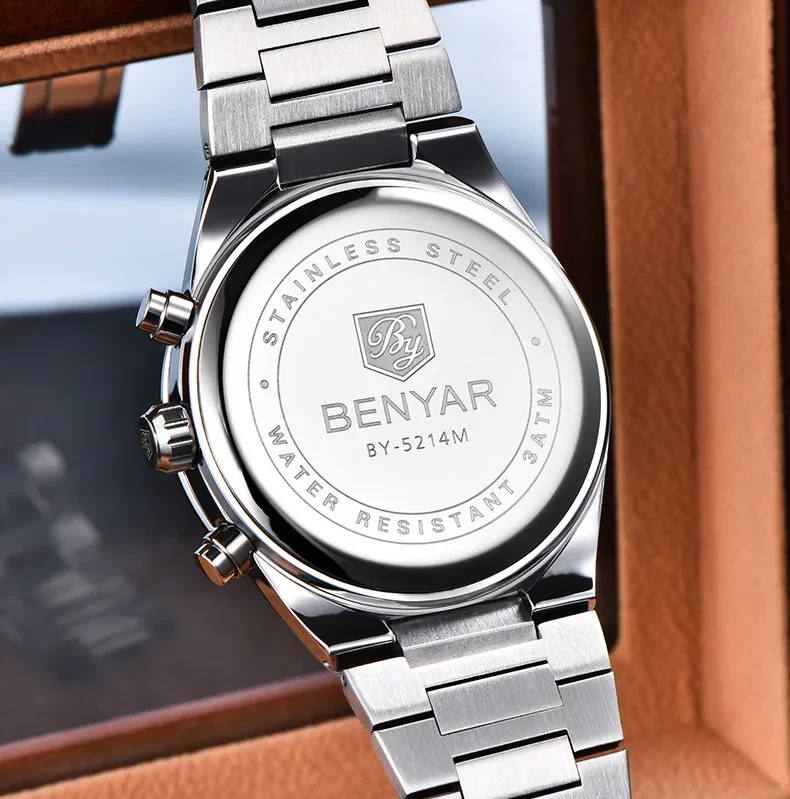 The BENYAR BY-5214M is a sleek men’s luxury chronograph watch designed for daily business wear, casual outfits, and sports activities. With its clean numberless layout, multifunction timing features, and stainless-steel build, it offers the styling and performance of a high-end timepiece at a very accessible price. -